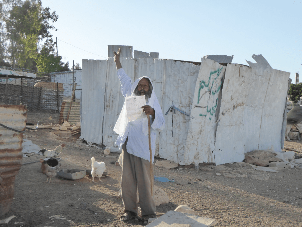 Nine years ago, when I was serving as a human rights monitor with EAPPI, a World Council of Churches programme, I visited the village Umm al-Khair in the West Bank to the south of Hebron. Israeli Settlers had built their homes together with an intensive poultry unit on the village land and were making life extremely difficult for the Palestinian residents. An old Bedouin man, Haj Suleiman, always protested when the Civil Authority (IDF administration) arrived to demolish Palestinian properties. In the photograph below he stands in front of a shed made up of crumpled metal sheets from an EU funded structure demolished by the IDF. He holds a demolition order in his hand. In January 2022 an Israeli police truck ran over Suleiman. The police left his broken body in the road. He died two weeks later in hospital.
