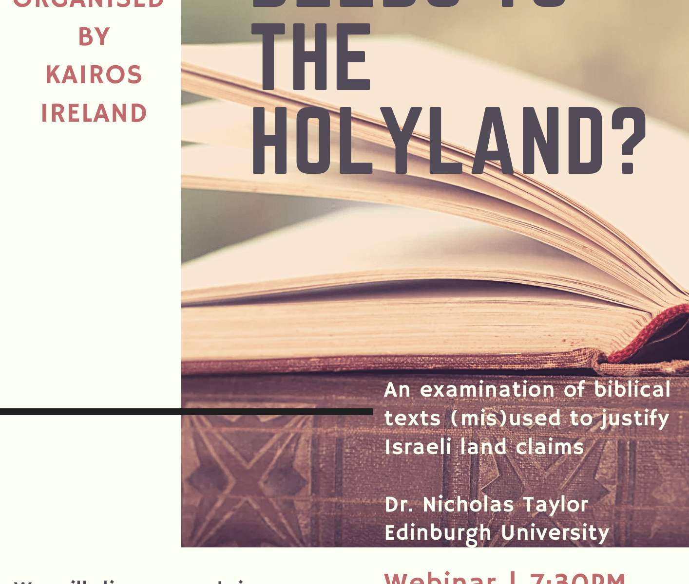 On March 26th Dr Nicholas Taylor of the School of Divinity, Edinburgh University gave a talk to Kairos Ireland "Title Deeds to the Holy Land?". We can now provide a recording of this very interesting talk. https://www.youtube.com/watch?v=fhyHyZg1wqc For those who would like to dive deeper into some of the topics covered in the talk there …